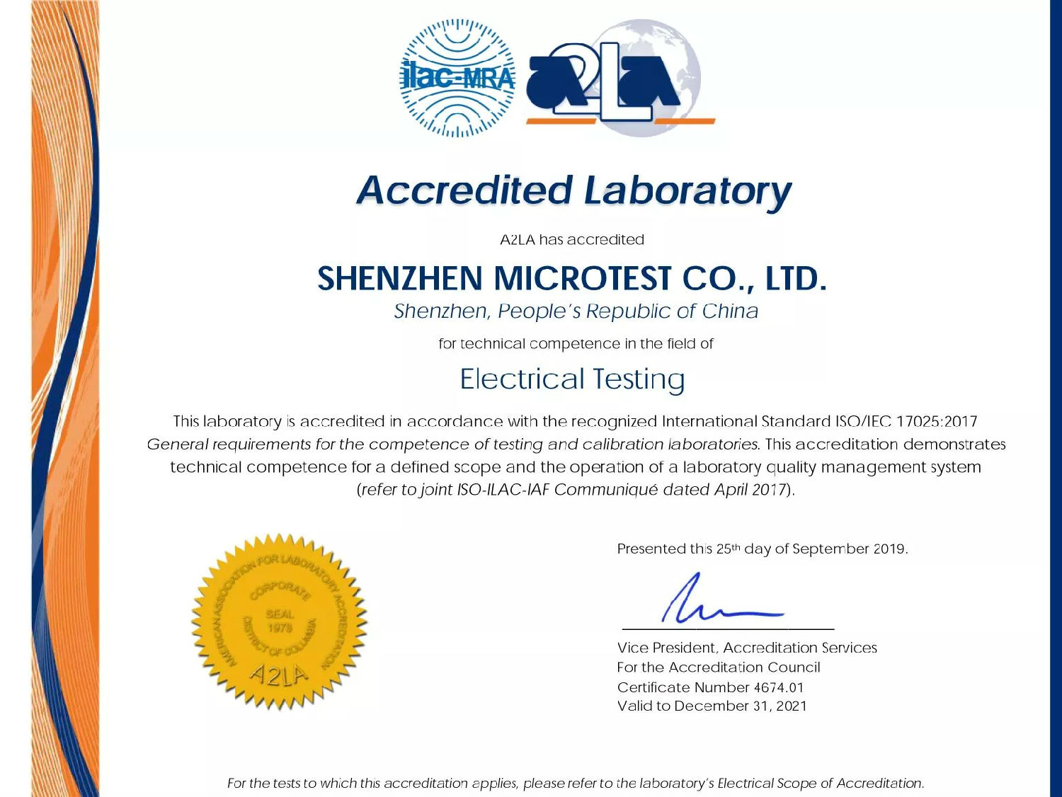 Microtest微測檢測在2018年正式獲得美國實驗室認(rèn)可協(xié)會American Association for Laboratory Accreditation(以下簡稱A2LA)授權(quán)的資質(zhì)認(rèn)可,成為全國首批美國FCC資質(zhì)認(rèn)可的非MRA國家實驗室。