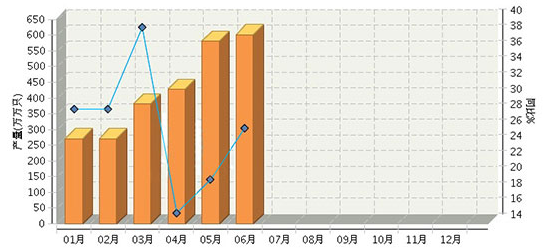 從圖表中可以看到,2016年上半年,全國(guó)LED燈具產(chǎn)品的的生產(chǎn)數(shù)量在不斷增加,行業(yè)累計(jì)產(chǎn)量達(dá)到2,96.92億只。其中2月到3月間增幅最快,同比增長(zhǎng)約38%,預(yù)計(jì)為企業(yè)年前收獲訂單,年后趕貨,使得燈具產(chǎn)量大幅增加。6月份行業(yè)產(chǎn)量為601.97億只,同比增長(zhǎng)26.12%,創(chuàng)上半年新高。