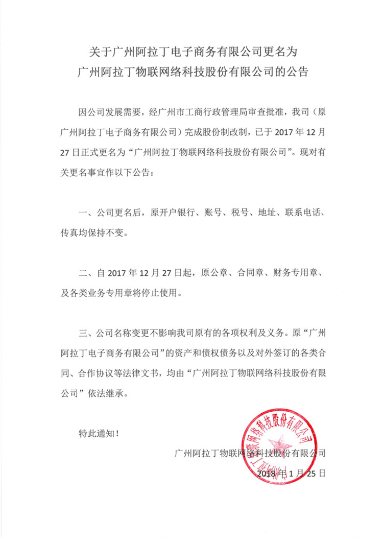 更名公告《關(guān)于廣州阿拉丁電子商務(wù)有限公司更名為廣州阿拉丁物聯(lián)網(wǎng)絡(luò)科技股份有限公司的公告》