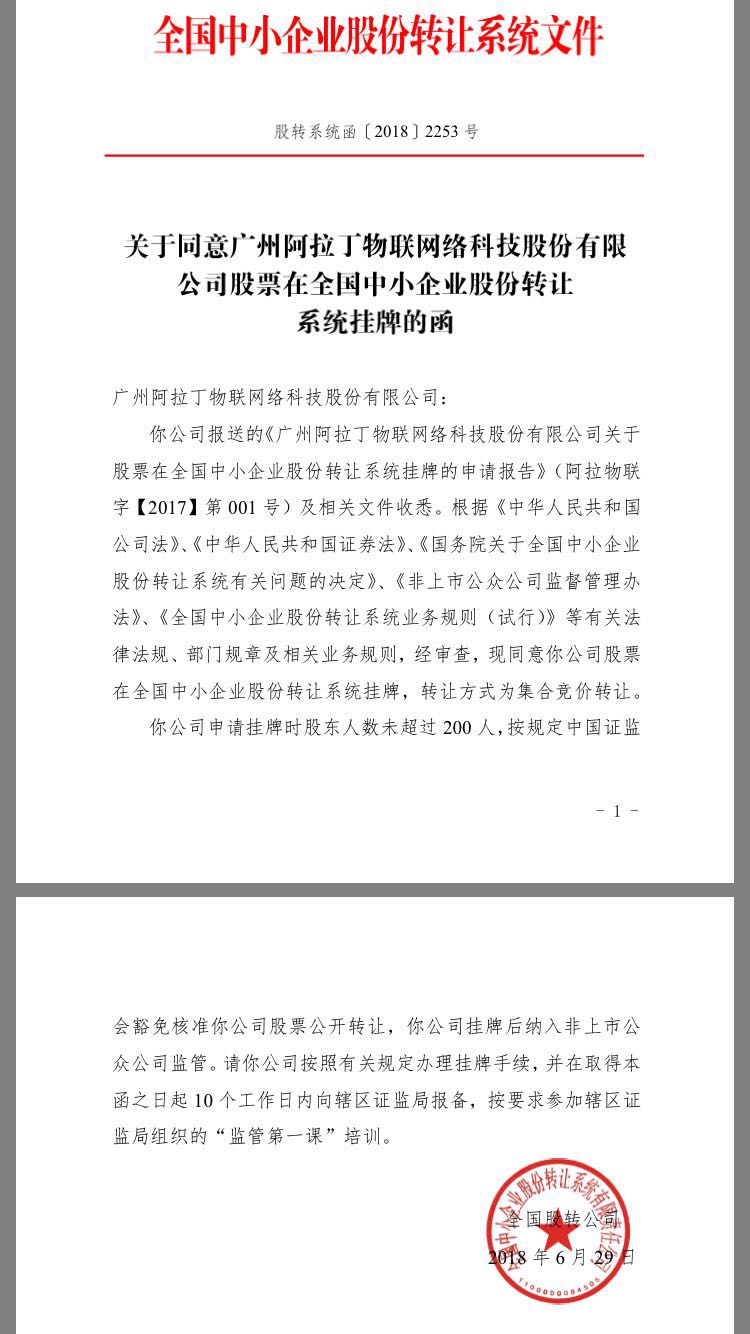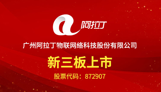 6月29日,根據(jù)全國中小企業(yè)股份轉(zhuǎn)讓系統(tǒng)有限責(zé)任公司發(fā)布的函件顯示,廣州阿拉丁物聯(lián)網(wǎng)絡(luò)科技股份有限公司在全國中小企業(yè)股份轉(zhuǎn)讓系統(tǒng)正式掛牌,成功登陸“新三板”,公司股票簡(jiǎn)稱為【阿拉物聯(lián)】,股票代碼為【872907】。